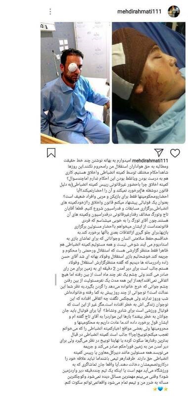 جالب است برای دیر آمدن ۲ دقیقه‌ای به زمین برای من رای صادر می‌کنند ولی چشم یک نفر چند ماه است از بین رفته اما هیچ اتفاقی نمی‌افتد؟ بعد از این همه مدت یک نفر مسئولیت از بین رفتن چشم جوانی که خرج خانواده می‌دهد را گردن بگیرد. به نظر شما این عدالت است؟ نوجوانی از چند روز پیش به کما رفته و خانواده‌اش شب و روز ندارند ولی هیچکس نگفت چه اتفاقی افتاده که این نوجوان زندگی اش به خطر افتاده است.