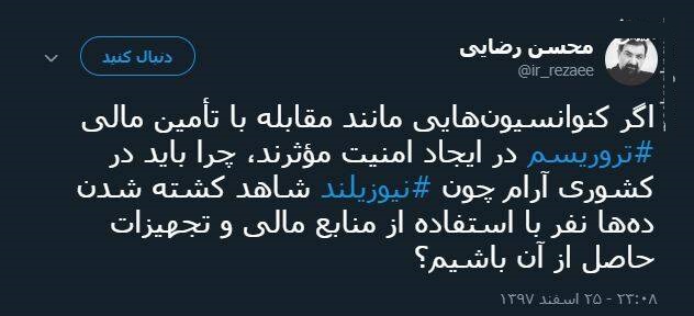 محسن رضایی دبیر مجمع تشخیص مصلحت نظام با اشاره به ناکارآمد بودن سازوکار کنوانسیونهای جهانی در جلوگیری از جنایت تروریستها علیه بشریت در حساب کاربری خودش در توئیتر نوشت: