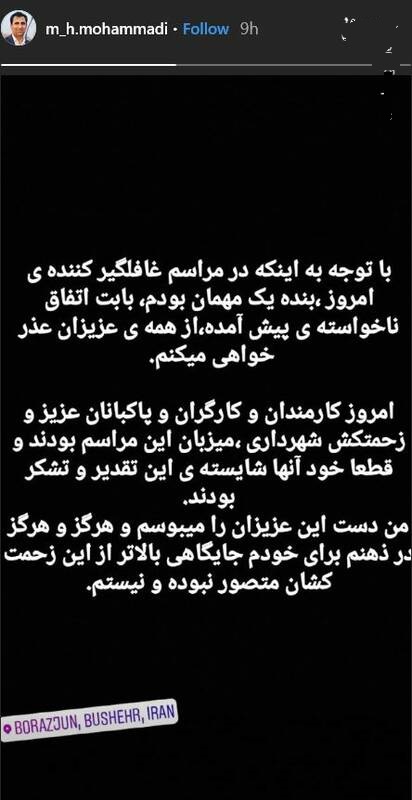 محمد حسن محمدی، شهردار برازجان در استوری صفحه اینستاگرام خود نوشت: