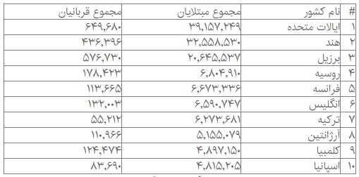 بنابر جدول به روز شده در پایگاه اطلاعرسانی "ورلداُمتر"، شمار مبتلایان و قربانیان این بیماری در ۱۰ کشوری که طبق گزارشهای رسمی بالاترین آمارها را تاکنون داشتهاند تا صبح امروز (پنج شنبه) به ترتیب به شرح زیر است: