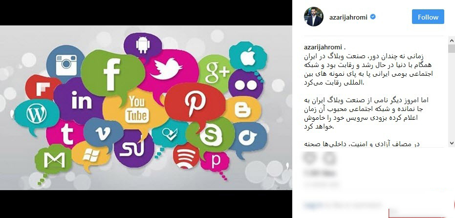 محمدجواد آذری جهرمی، وزیر ارتباطات و فناوری اطلاعات، با انتشار مطلبی در صفحه اینستاگرام خود در مورد مسدود کردن شبکه های اجتماعی خارجی و مشکلات موجود بر سر راه توسعه شبکه های اجتماعی داخلی و لزوم حمایت از آن‌ها توضیحاتی را ارائه داد.