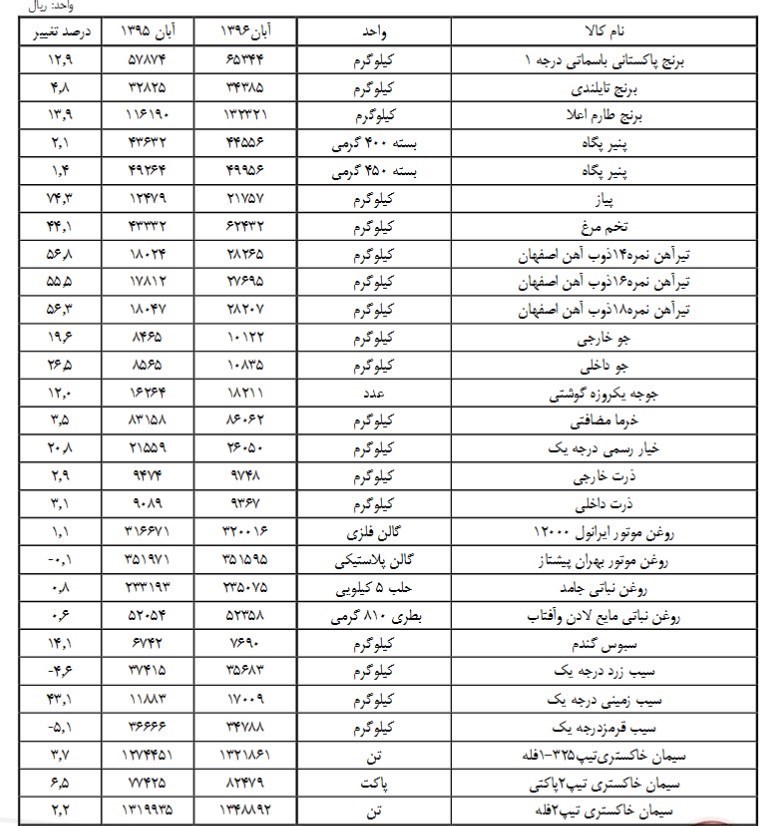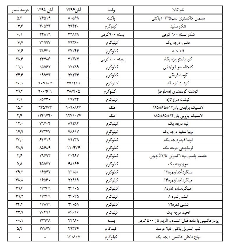 جزئیات تغییرات قیمت کالاهای اساسی و مهم در تا پایان آبان ماه امسال به شرح زیر است: