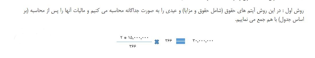 عیدی را به روش زیر به صورت جداگانه محاسبه میکنیم و مالیات آنها را پس از محاسبه (بر اساس جدول) با هم جمع میکنیم.